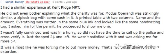 一般不愿意捐钱的行人直接掉头走掉就好,然而最近又发生了被强行要求募捐的事件。近日,在义安理工学院附近,有好几名青年拦住一名放学准备乘巴士的学生,死缠烂打要求募捐。该学生或许是看他们人多势众,无法轻易脱身,只好答应捐款了事,不料对方竟然狮子大开口索要百余新币,该学生只好被迫掏钱。