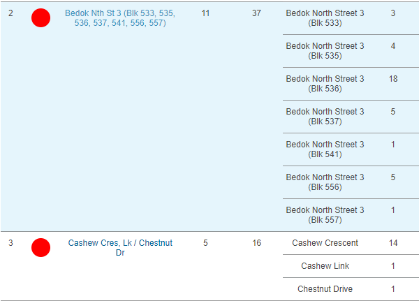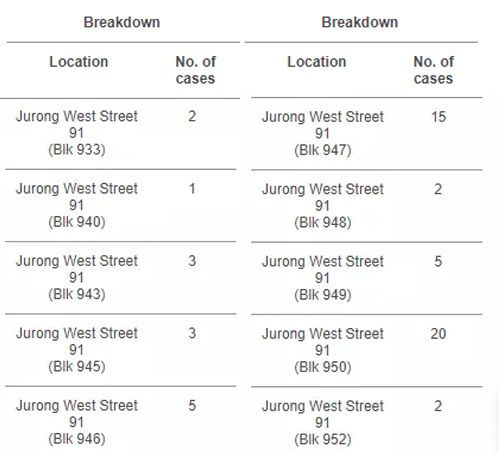 病例主要集中在裕廊西91街(大牌933号,940号,943号,945号,946号,947号,948号,949号,950号,952号)和92街(大牌920号,928号)。