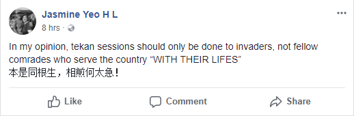 但今天,他们在Facebook上发了一则推文:“我认为,折磨手段(Tekan session)应该用在敌军身上的,而不是用在‘以生命’保家卫国的同袍身上。本是同根生,相煎何太急”。