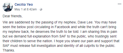 4月30日,新加坡一名服役中19岁士兵李函轩(Dave),中暑抢救12天后不治身亡。亲属要求彻查死因,并公布调查结果。
