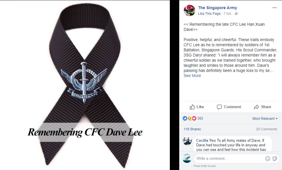 今天,新加坡武装部队也在Facebook上表达了对李函轩的哀悼。同时决定追加李函轩为“一等中士“军衔,并为他安排军事葬礼。