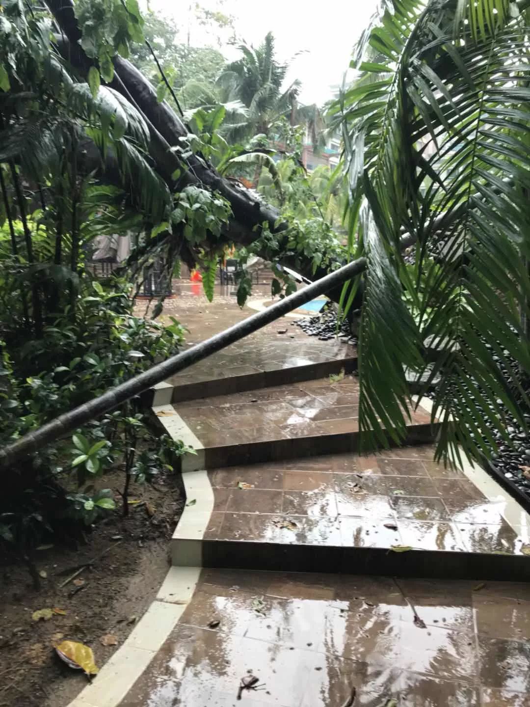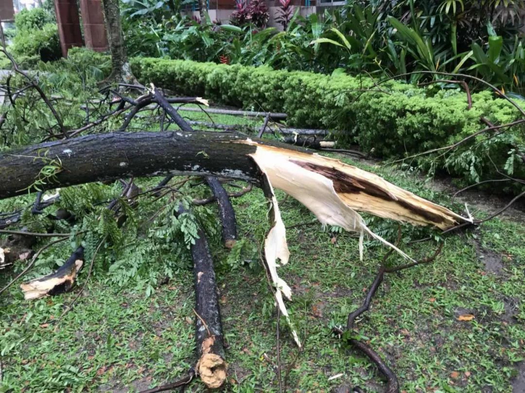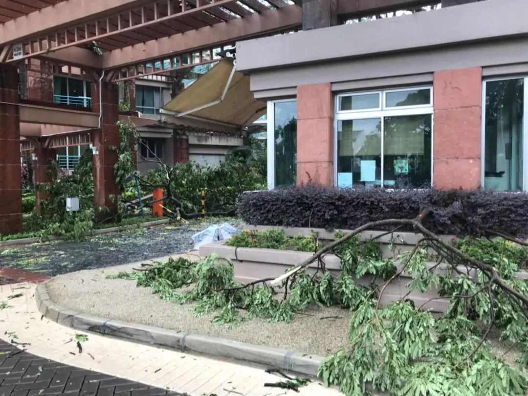 换个角度再走进一点看,就知道有多糟了。大树倒下来,把路边的人行道遮雨棚都压弯了。可以想象,如果那时如果恰好有行人经过,也是灭顶之灾!