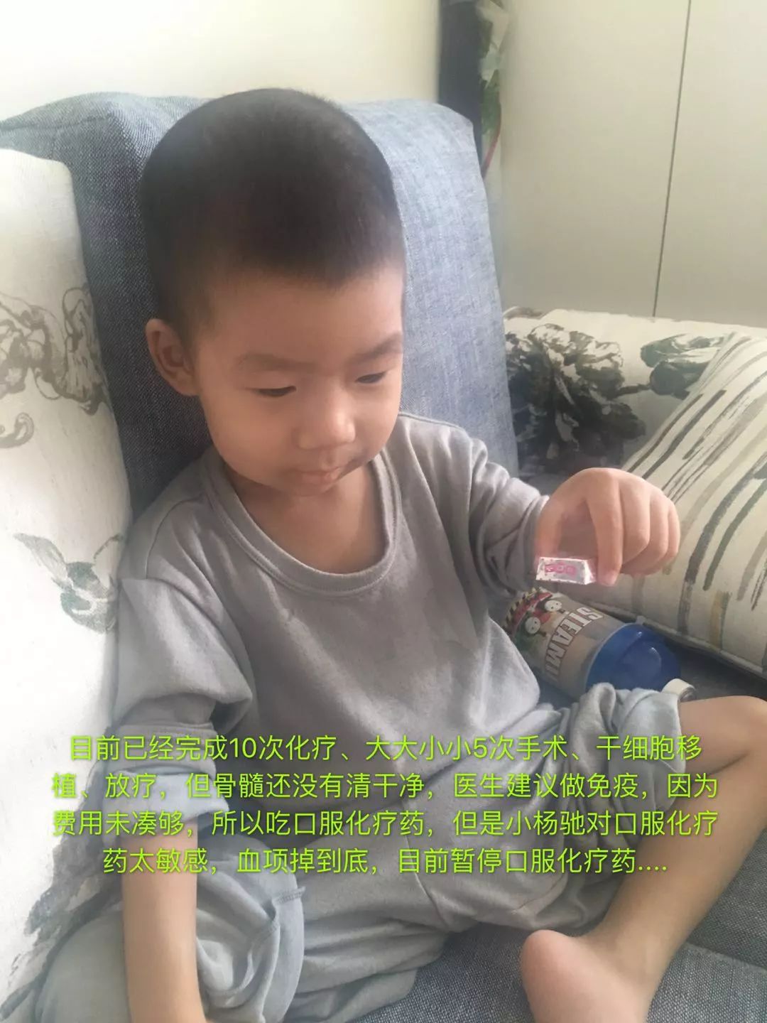 在骨穿检查中发现骨髓还有残留,医生建议做免疫,来到新加坡看病已经花费了近40万新币,对于一个普通的工薪家庭这是一笔不小的开销。所以只能改吃口服化疗药,但由于杨驰对这个药太敏感,白细胞、血小板、血红蛋白掉变成了个位数,无法继续服用,现在唯有免疫可以清除微残留。