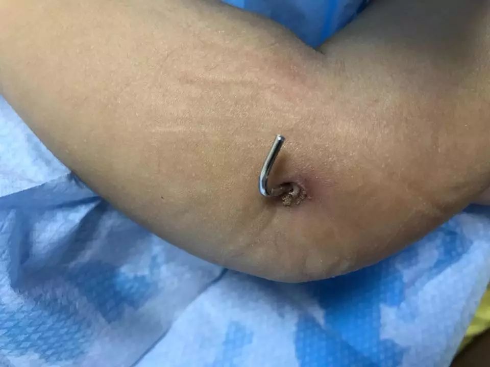 ▲女孩骨折的手臂需要用两根铁丝固定骨头