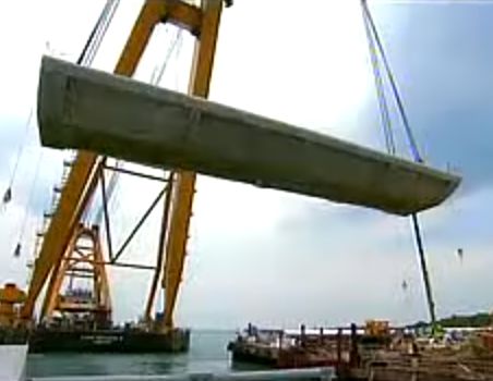聪明的工程技术人员们利用围堰(即一种巨大的防水钢结构体)来抵抗海水对工程的施工的阻碍以及确保在里面施工人员的安全。为了确保大型机械的灵活运作,工程技术人员又加固了围堰的地基,用震动锤将钢板桩打入到海床下40多米深处。