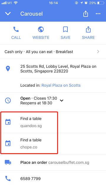 但是目前,谷歌只和3个餐厅订座平台合作,他们是 Chope、HungryGoWhere 和 Quandoo。