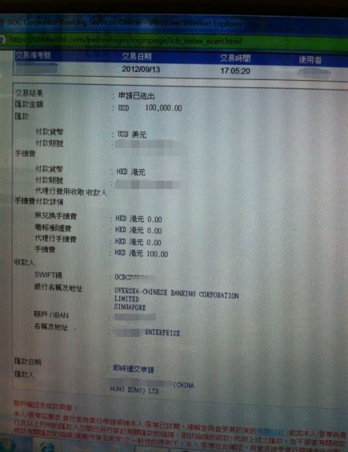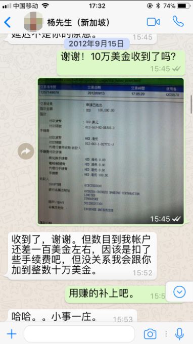 因为想到新加坡是法治国家,法律非常严,而且如果我要退出,至少本金能拿回来,于是便答应他,并于2012年9月13日花了636500元人民币兑换成10万美金汇到他给的帐户。