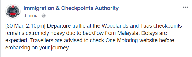 政府和交通公司纷纷提醒鉴于这么严重的堵车现象,ICA发出紧急通知,提醒需要返回新加坡的司机可以寻求ICA的帮助。同时ICA也在一直发布即时消息,提醒大家当下拥堵情况。