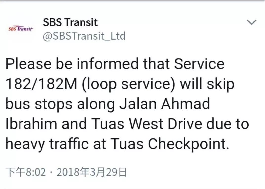 新捷运昨天晚上8点发布推特,受到大士关卡影响,无法停靠惹兰阿末依布拉欣(Jalan Ahmad Ibrahim)和大士西通道的站点,182和182M号巴士不得不改道。