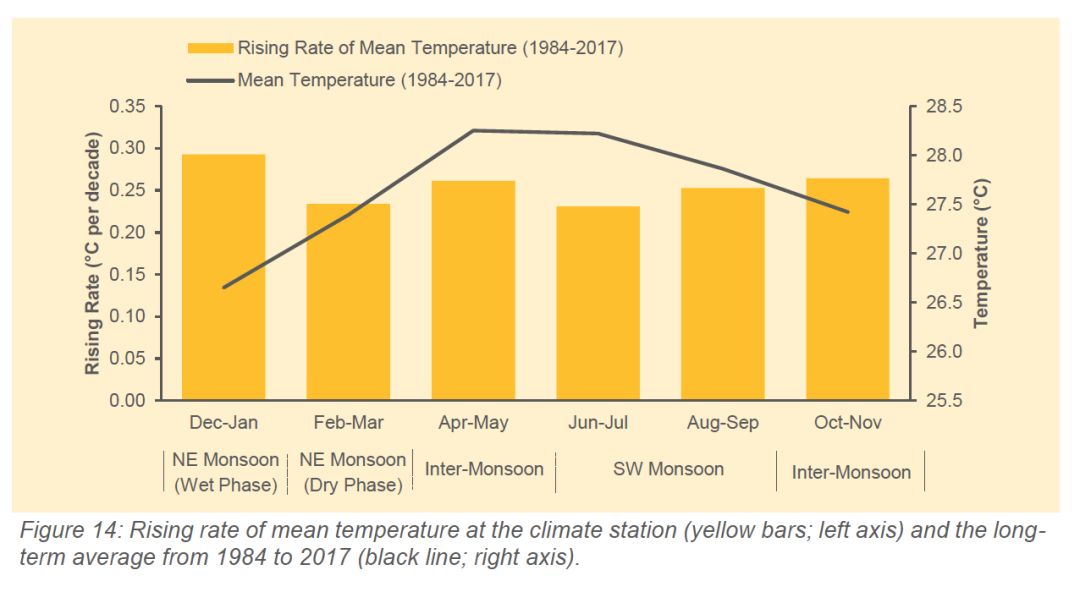 无论是每日平均气温还是白天最高气温,全年每个月份的月均气温都出现了上升的趋势。其中,12月-1月的月均气温涨幅最大。值得注意的是,12月-1月通常是新加坡每年最凉快的时间;不过最近这几年的月均气温却出现了上升的趋势。