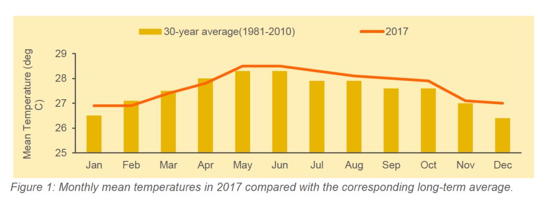 除了2月,3月和4月的全月平均气温略低之外;2017年其它剩余9个月的全月平均气温都高于长年平均数值。