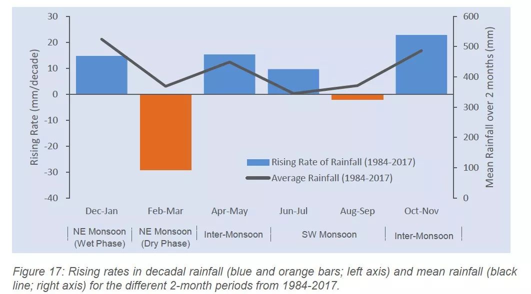 12-1月,4-5月和10-11月的降雨量出现了上涨的趋势,其中12-1月雨季的降雨量的涨幅最大,正以每10年的速度上涨15毫米。反过来说,2-3月和8-9月较干燥月份的降雨量却呈现了下降的趋势;其中2-3月的月均降雨量正在以每10年的速度减少30毫米!!!这样一来,新加坡每年旱季和雨季的降雨量的显明差距就进一步的扩大。