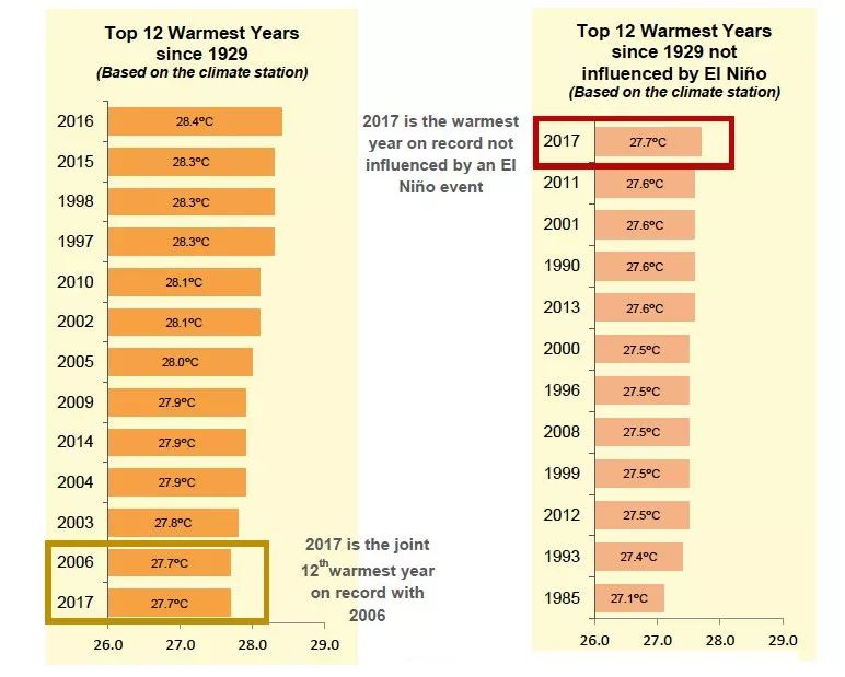 虽然2006年和2017年的全年平均气温几乎一样,不过前者出现了厄尔尼诺现象;而后者并没有受到任何厄尔尼诺的影响。要是把所有发生过厄尔尼诺现象的年份排除在外,那么2017年其实是在所有非厄尔尼诺的年份里气温最为炎热的一年!!!
