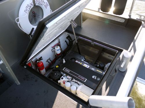 之后,工作人员让游艇主人重启发动机,因为这样才能打开发动机舱口。