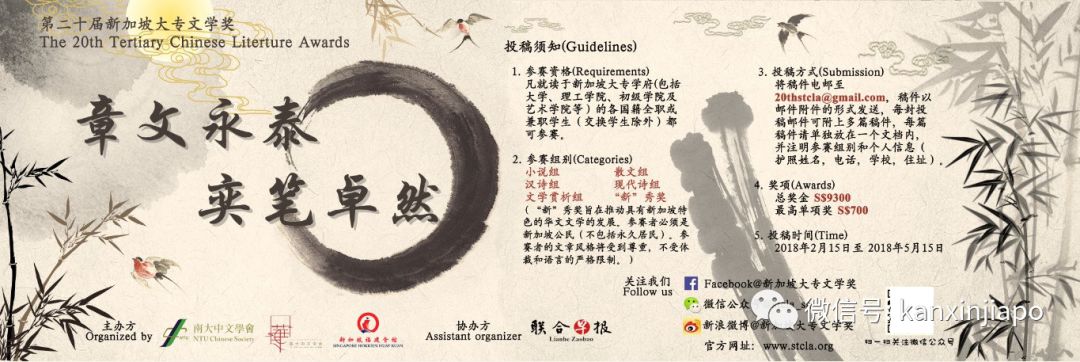 新加坡国立大学中文学会、南洋理工大学中文学会主办第二十届新加坡大专文学奖(Singapore Tertiary Literature Awards)活动正在开放征稿。大专文学奖由新加坡福建会馆赞助,《联合早报》协办,旨在促进本地华文文学创作和发掘华文创作人才,最高单项奖奖金高达$900,跨组别奖项兼获兼得。