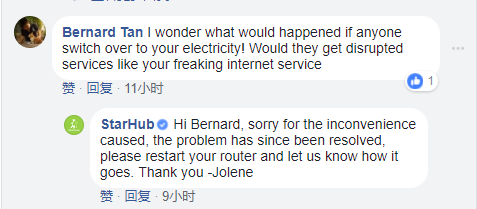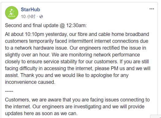 随后,星和公司迅速在Facebook上做出解释,由于网络硬件出现问题,导致住宅的光纤和宽带服务间歇性中断,工程师进行抢修后,公司表示,会继续密切观察网络性能,确保服务稳定。在此也向受影响用户致歉。