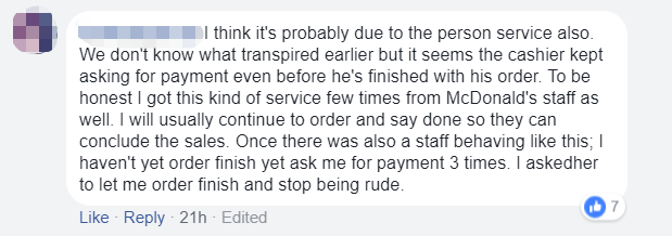 我觉得对方的服务态度也有问题。我们不知道之前具体发生了什么,但是服务员在他还点餐的时候就不断要钱。说实话我在麦当劳也有遭到好几次类似的待遇。有一次,我还没点完餐,麦当劳店员就前后3次叫我付钱。我告诉她,让我先点完餐,不要这么没礼貌。
