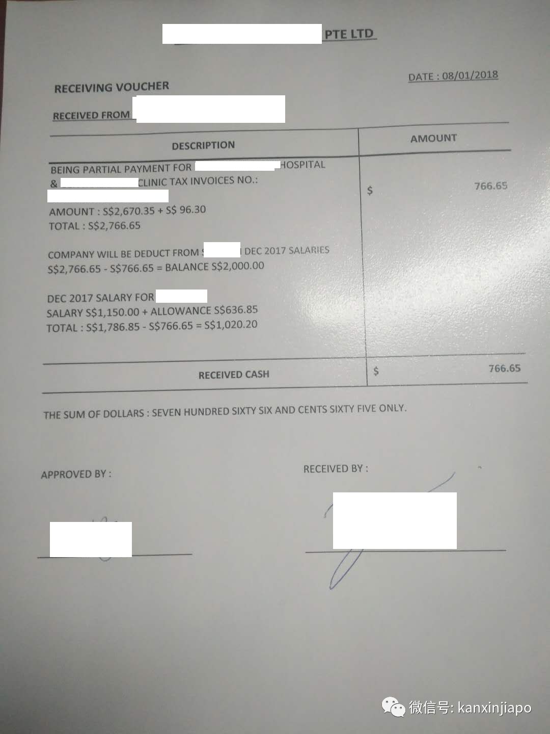 公司是1月5日开工资,给现金。因为当时我身体不舒服,还在病假中,所以没有去拿工资。到了1月8日,老板打电话让我去趟公司,老板说我生病是因为自己的原因,并不是在工作中断了手脚,所以2700多新元的医药费要自己还,而且将工资先扣了700多块。