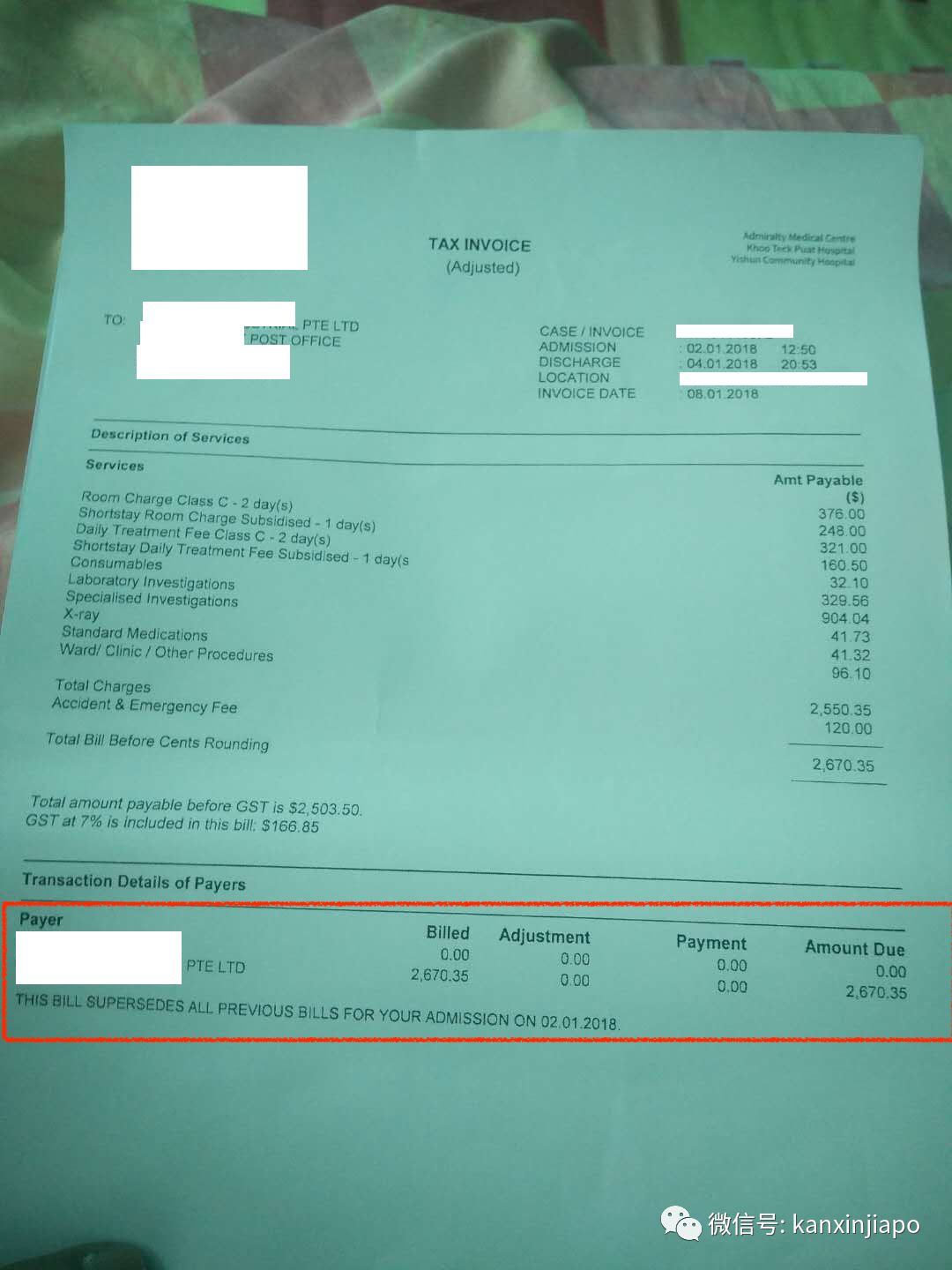 ▲医药费单据上也显示,费用直接寄给公司,由公司偿还