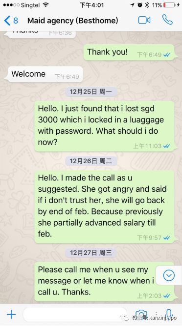 她说:“这样,我做到一月底,然后250新币你拿来给我买机票好了。”我又一次让步,这时已经凌晨1点半,她的表亲突然打电话,中断了我们的谈话。我一宿没怎么睡,听着外面的动静,害怕她连夜出逃,毕竟如果说之前她只是有嫌疑的话,那她今晚的表现已经是对她嫌疑最好的回答。