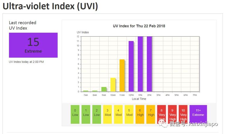 新加坡国家气象局使用的就是国际标准,只要指数突破8,就有必要进行额外的防晒保护。UV指数达到11,就算“极端”强紫外线天气。