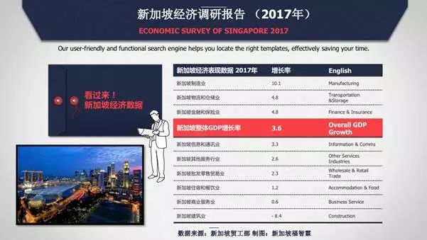 根据新加坡贸工部在这个月(2018年2月)发布的新加坡经济调研报告显示,新加坡经济在去年的整体增长率为3.6%。其中制造业表现超出预期,增长了10.1%;物流和仓储业在积极创新转型的发展中扩张了4.8%;金融和保险业稳健前行,增长率也是4.8%;信息通讯业增长率为3.3%;批发零售贸易业增长了2.3%;住宿和餐饮业增长率为1.2%, 商业服务业基本保持现状,增长率为0.6%。
