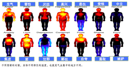 我们都知道运动可以促进血液循环,但却不知道“情绪”和“压力”每分每秒都在影响我们的气血循环。芬兰科学家用实验证明了身体各个部位的气血因情绪产生的改变,如图: