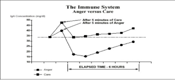 而5分钟的关爱他人的情绪,会使人体免疫力在过后6个小时的时长中不断提高。反之, 5分钟的愤怒情绪,会使我们的免疫力迅速下降,6个小时之后还不能完全回到平均水平。
