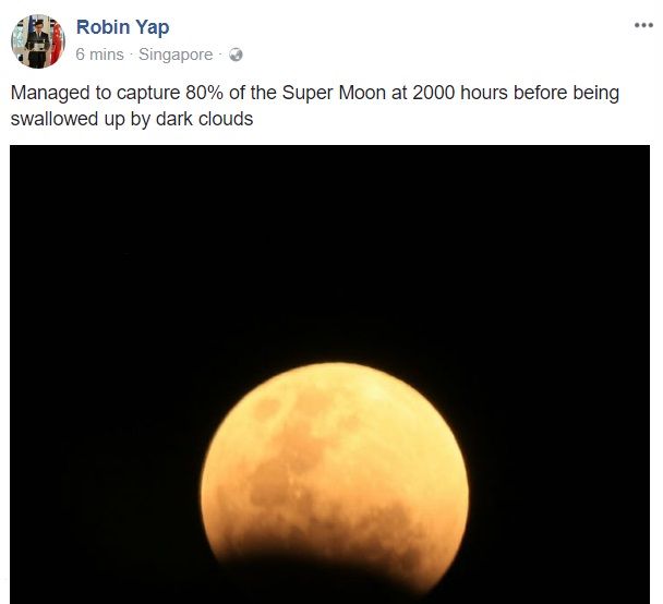 (Robin Yap: 在晚上8点,赶在被乌云吞噬前,拍到超级月亮的80%)
