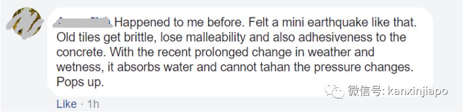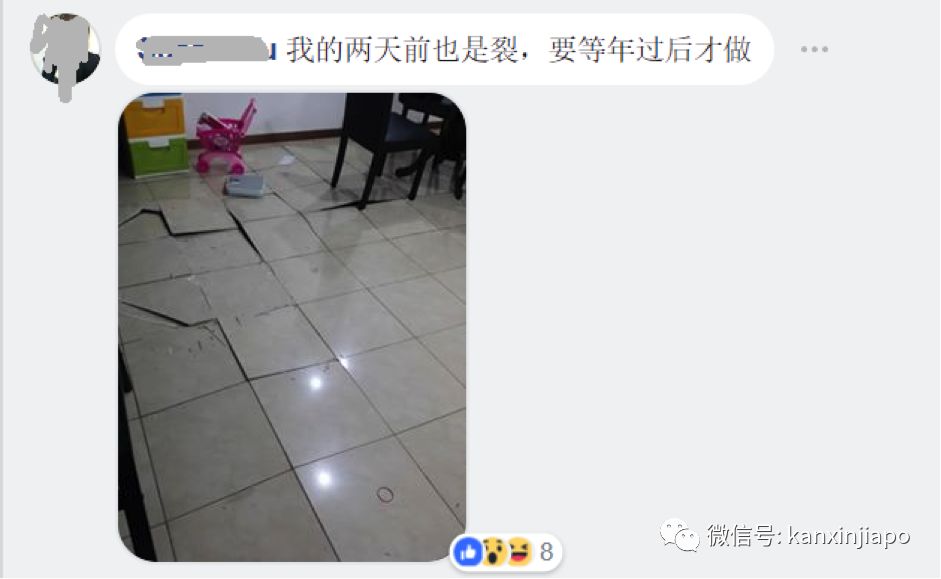 也有网友分享自己之前的经历,表示地板瓷砖炸裂感觉就像个小地震,旧瓷砖变得易碎,失去延展性以及和水泥地之间的粘附度,加上近期天气寒冷潮湿,导致旧瓷砖吸水,最后因为无法承受压力,所以从地面翘起。