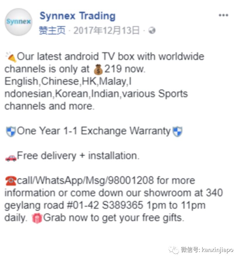 Synnex在Facebook上打出的安卓机顶盒广告,宣称只要使用自己的机顶盒,就可以观看韩国、香港、中国、马来等国家的各种体育频道。这要是“被端了”,以后还能不能在家里舒舒服服地看球赛啦?