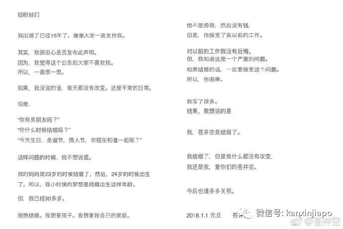 1月1日晚,“德艺双馨”的苍老师,突然在微博发文,宣布结婚,真让人晴天霹雳!