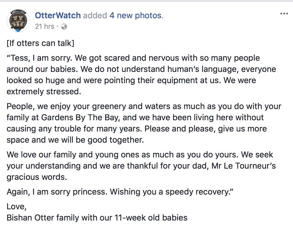随后,新加坡水獺保育团体Otter Watch通过官方Facebook以水獭的口吻向Tess道歉: