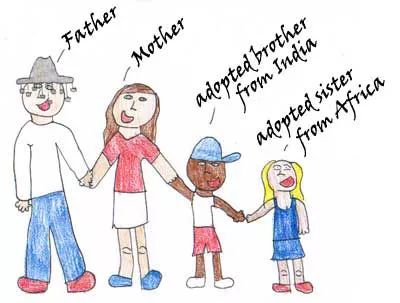 ▲示意图:爸爸、妈妈、领养自印度的哥哥和领养自非洲的妹妹