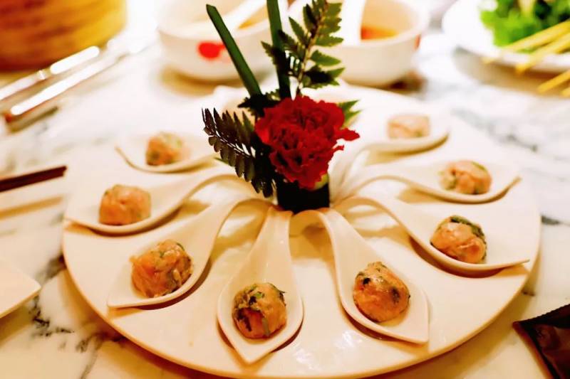 (选用上等五花肉,加入香菜、鸡蛋、葱调匀制作而成)