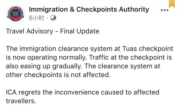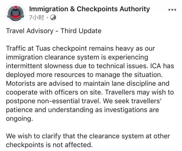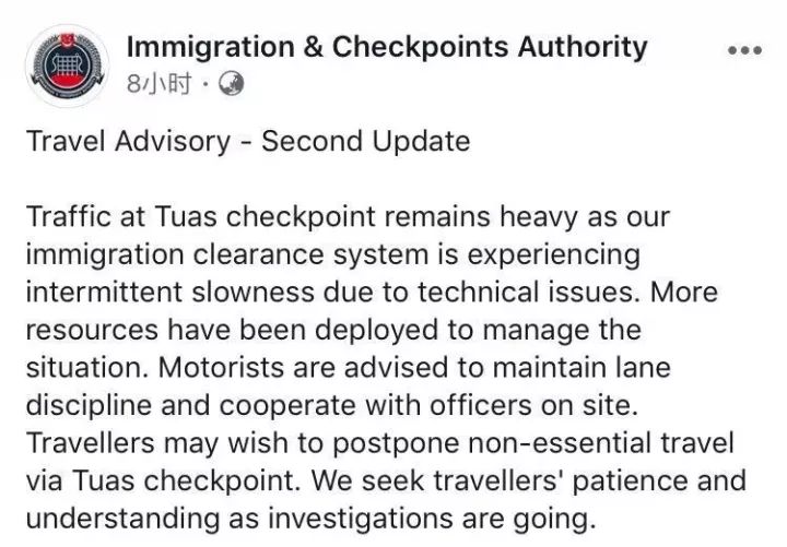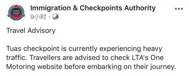 今天早晨8点多钟,移民与关卡局就发布通告:大士关卡出现交通拥挤,建议大家出行前查阅陆交局网站。