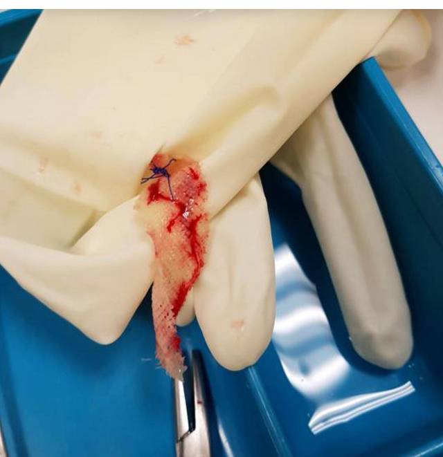 11月16号,陈女士返回国大医院拆除真空泵,医生对伤口进行了缝合,总共四针。谁知,4天后,当陈女士来医院复诊时,伤口处竟然有一块纱布冒了出来。原来当时,医生只取出了泡棉,竟然把纱布忘得一干二净!