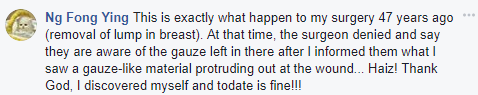 更有人表示,她47年前切除肿瘤时也出现类似的情况,而且外科医生还否认有纱布