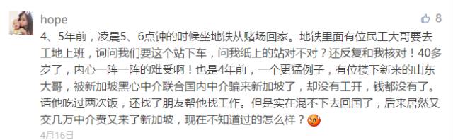 还有~12岁女孩的父亲,才来几个月,就因工作场所大火而被95%烧伤,命丧新加坡;因为工伤还可能被解雇并遣返回国,看中国籍劳工在新加坡怎么就这么惨?又有25岁客工因为高昂的中介费还没有赚回来,就被老板炒了鱿鱼,巨大的心理压力下,他选择了结束自己的生命。