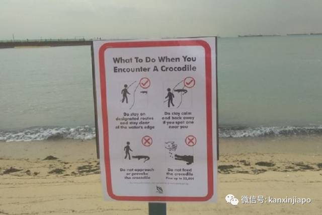告示牌指出,小伙伴如果撞见鳄鱼,应该保持冷静,并立刻远离海域,不应该同鳄鱼接触,也不应该喂食鳄鱼。如果被发现违例喂食鳄鱼,最高罚款额为5000新币。