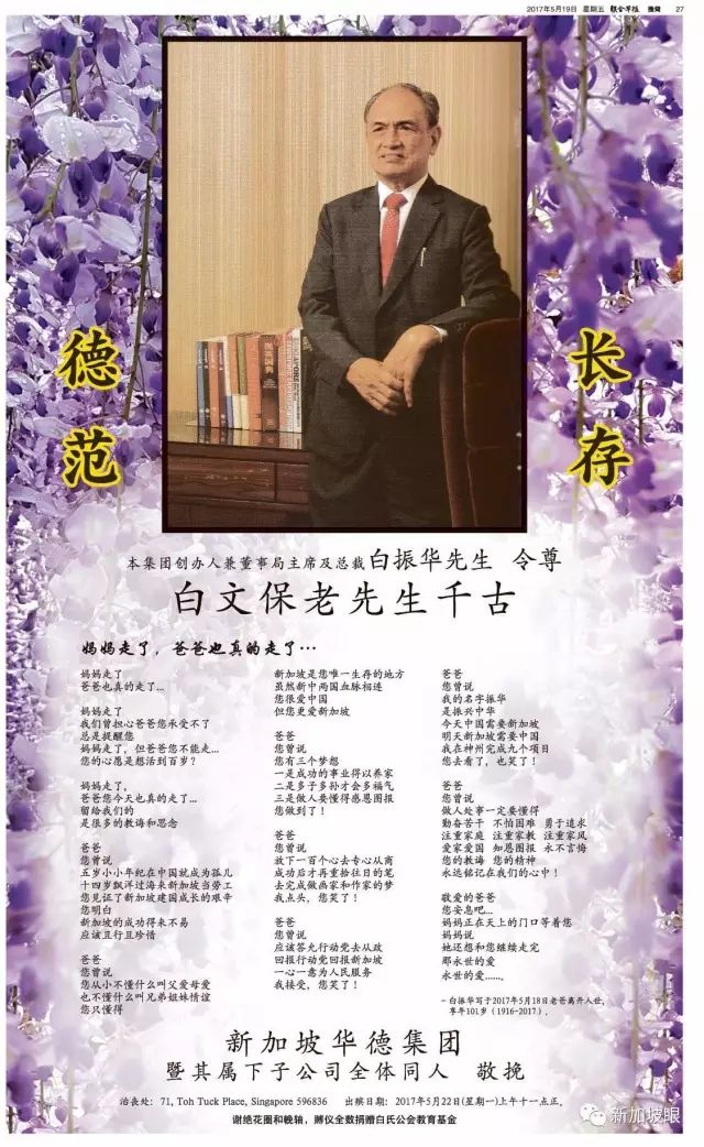 新加坡眼介绍过的白文保老先生的白金,也全数捐给了白氏公会的教育基金。