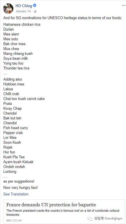 连总理夫人何晶也在她的脸书上,列出了长长的一串新加坡美食,为申遗献策!