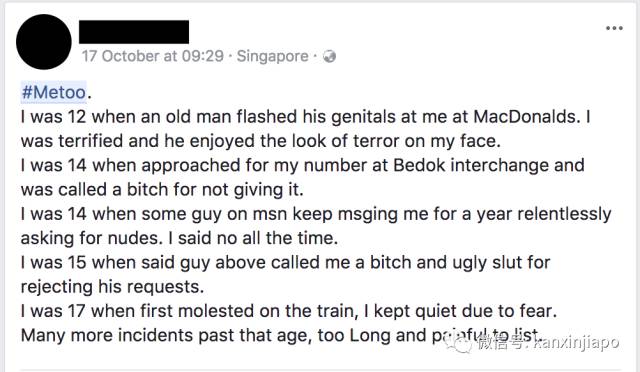 有人分享说,自己在12岁时,在麦当劳遇到一个老男人,向她展示自己的生殖器;之后在17岁时又在地铁上被非礼,但她当时选择沉默。
