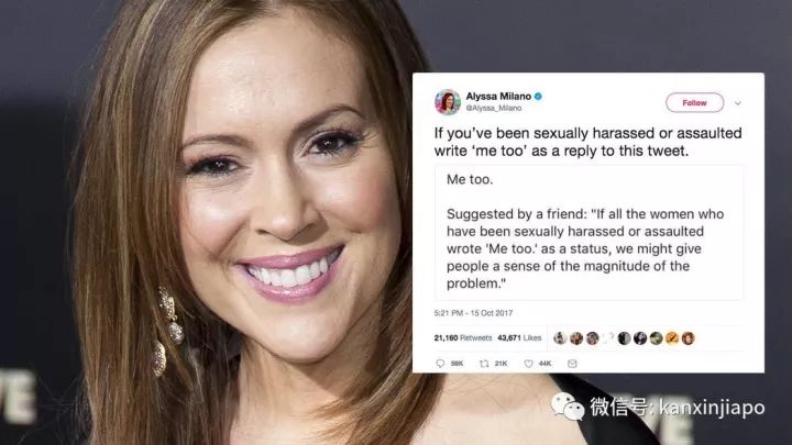 她呼吁其他女性同胞,如果曾经遭遇性骚扰或性侵害,便发推特并加上 “我也是” (#MeToo)的标签。她说,如此简单的一句话,或许我们可以让大家知道,这种问题究竟有多么严重。