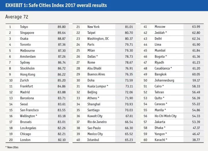 前三名依次是日本东京、新加坡、日本大阪,这与2015年公布的前三名排行一致。