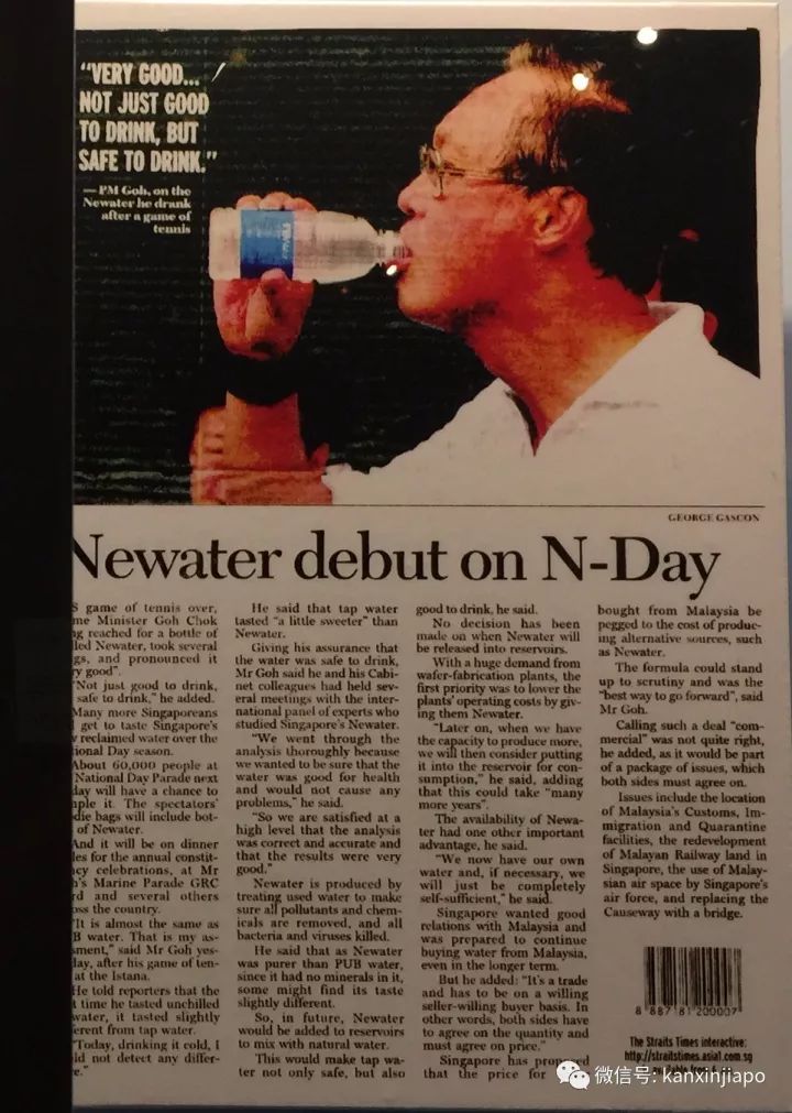 2002年8月1日早上,时任总理吴作栋在总统府的网球场打完球后,大口喝下新生水,标志了新加坡新生水的技术研发成功。