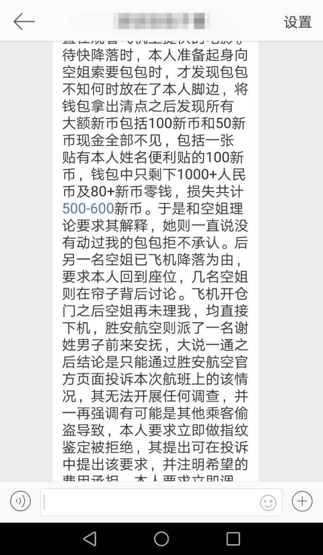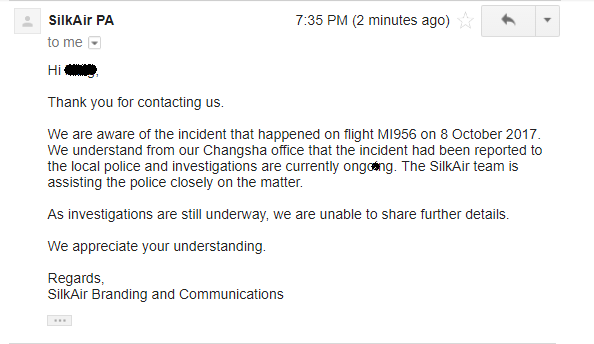新加坡眼今日有电话联系胜安航空相关负责人,据他们反馈,胜安航空已获悉沈姓乘客投诉一事,目前正在展开内部调查。胜安航空在长沙的办公室已经与长沙机场的机场警察取得联系,以协助调查。