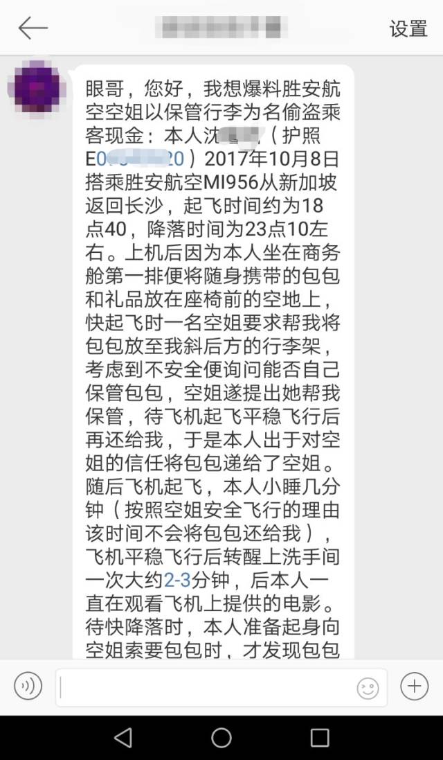 编者按一乘客在上飞机时将提包交给空姐保管,下飞机前跟空姐拿回提包时却发现里面的钱不翼而飞!乘客个人认为是空姐偷拿,且航空公司方面没有积极调查,以致此事最终不了了之,因此投书新加坡眼,希望将事件公诸于众。