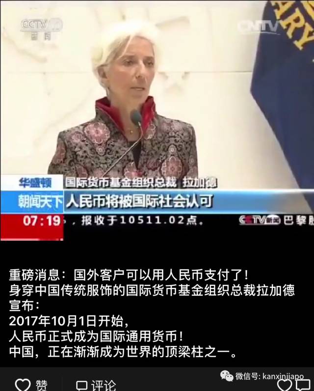 哎呀!那不是去年9月30日,拉加德宣布人民币进入IMF特别提款权(SDR)货币篮时穿的那件衣服吗?当真IMF穷成这样,贵为总裁,一件衣服穿两回?