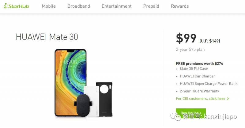 华为Mate30系列和M1、StarHub都有合作,推出了合约机套餐。